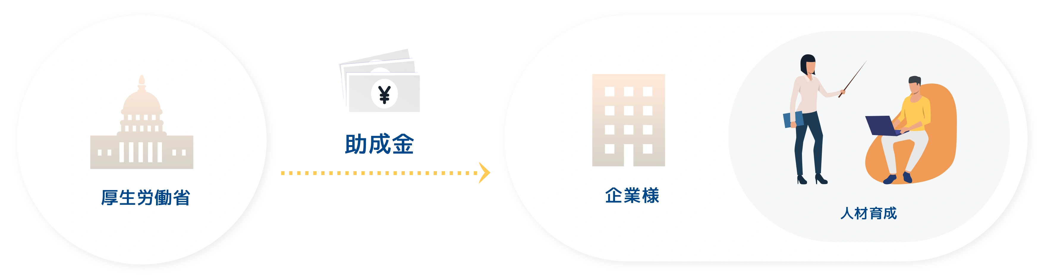 人材開発支援助成金は、企業様が雇用する労働者に対して、職務に関連した専門的な知識及び技能を習得させるための職業訓練等を計画に沿って実施した場合等に、訓練経費や訓練期間中の賃金の一部等を助成する制度です。